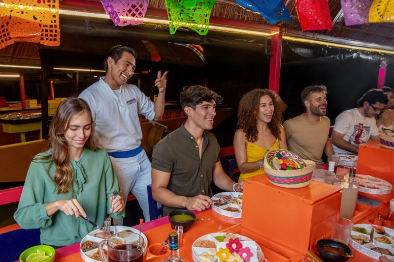 Antes de abordar la trajinera podrás divertirte en una kermés mexicana con juegos, esquites y deliciosas aguas frescas. Durante el recorrido, te deleitarás con auténticos platillos y postres mexicanos para saciar tu antojo.