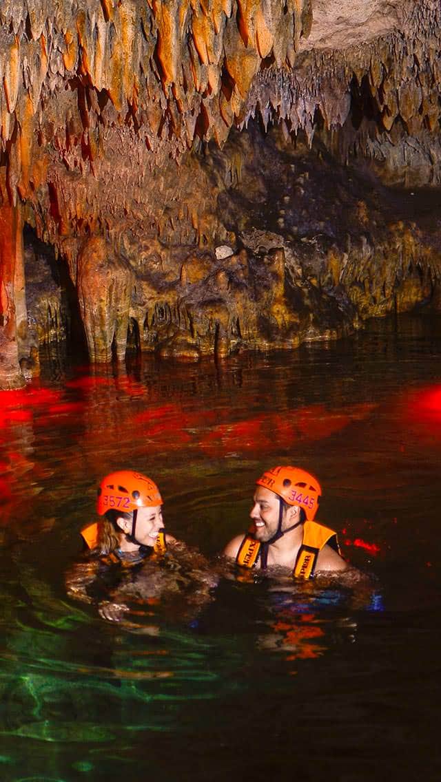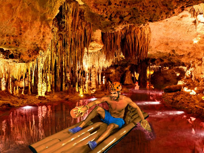- Recorrido en río subterráneo a bordo de una balsa, remando con las manos.